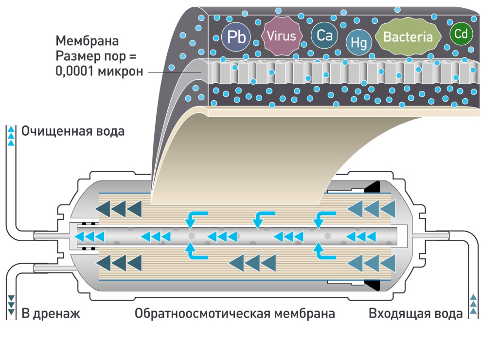 Ни один другой фильтр не способен удалить настолько широкий спектр загрязнений. Системы обратного осмоса отторгают пестициды, радионуклиды, тяжёлые металлы и вирусы.